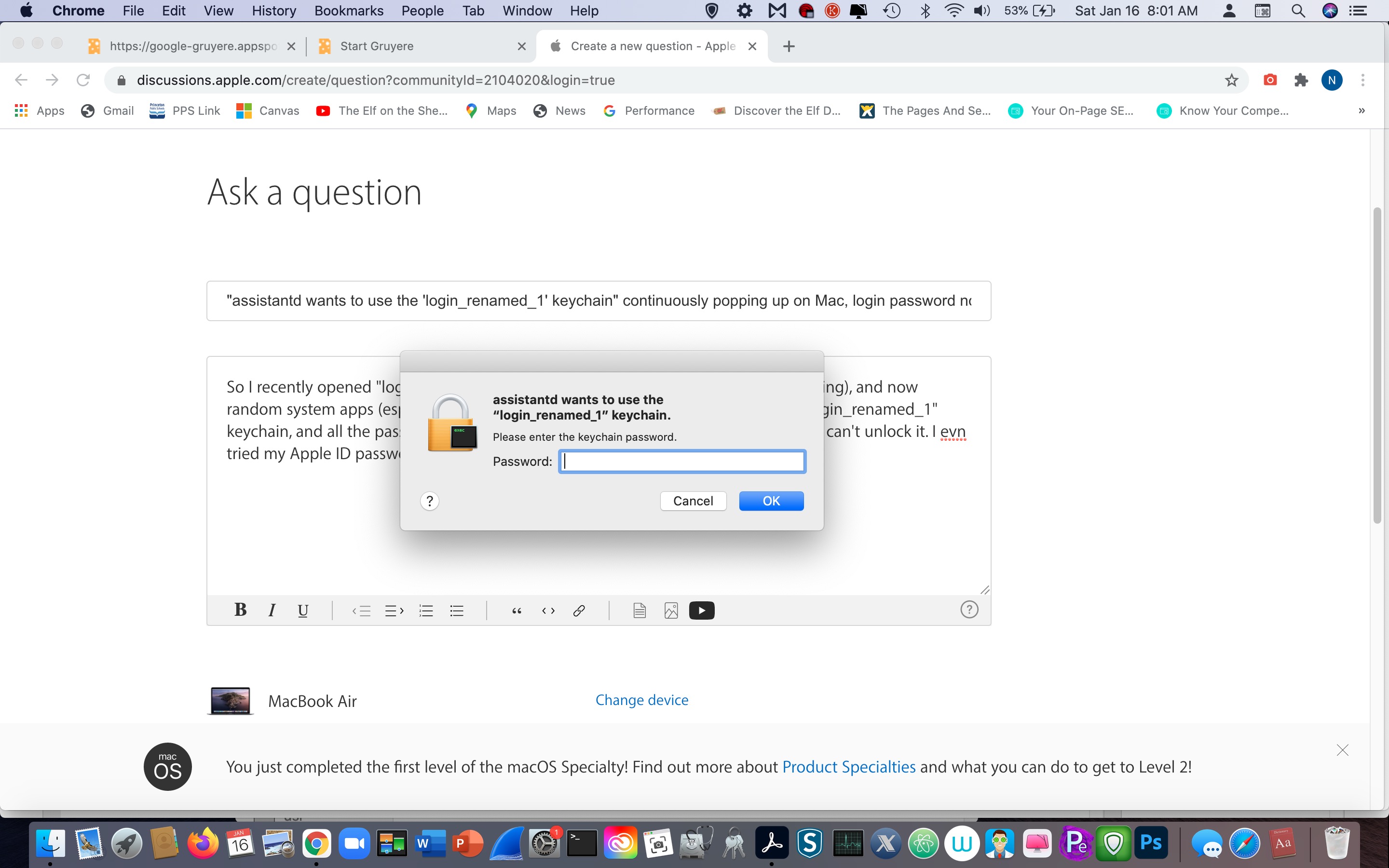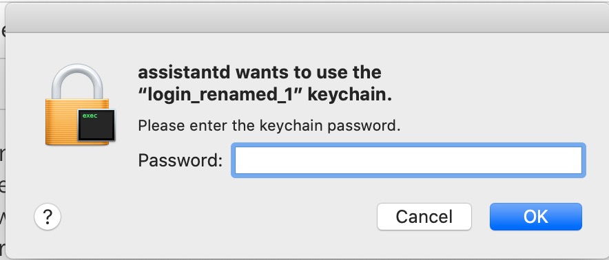 "assistantd wants to use the 'login_renamed_1' keychain" continuously popping up on Mac, login password not recognized