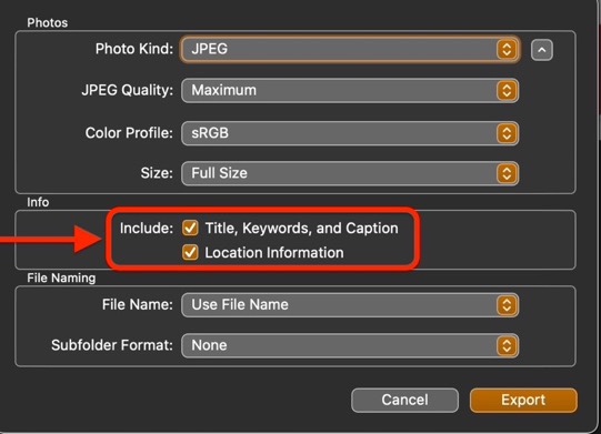 Thank you. I exported a photo from mac photos with a title, description, and key word to my mac desktop, using the process you forwarded to me. When I opened the exported file on the desktop I saw the title but could not find a way to see the description or the key word. I was hoping I could use the description box of the photos photo to type in information that could then be read in a photo I could send by email or social media.