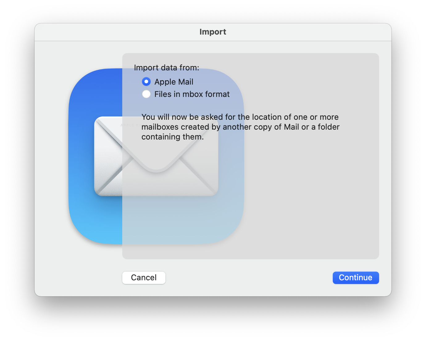 Then I go into my Apple Mail, choose from the Menu "File">"Import Mailboxes...", and then I face this option: