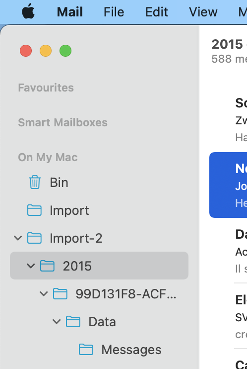 Sure, the messages are all in the folder Import-2/2015. But on my previous computer, I was not shown all the "ugly innards" of the 2015 folder, no subfolders called "99D131..." etc.
