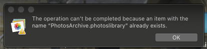"The operation can't be completed because an item with the name PhotosArchive.photoslibrary already exists."