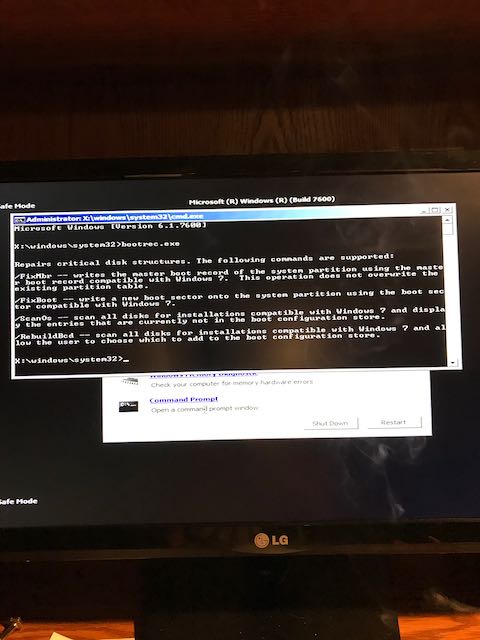 Also, you will need /fixMBR and /fixBoot under Bootrec.exe. See https://support.microsoft.com/en-in/help/927392/use-bootrec-exe-in-the-windows-re-to-troubleshoot-startup-issues for reference.