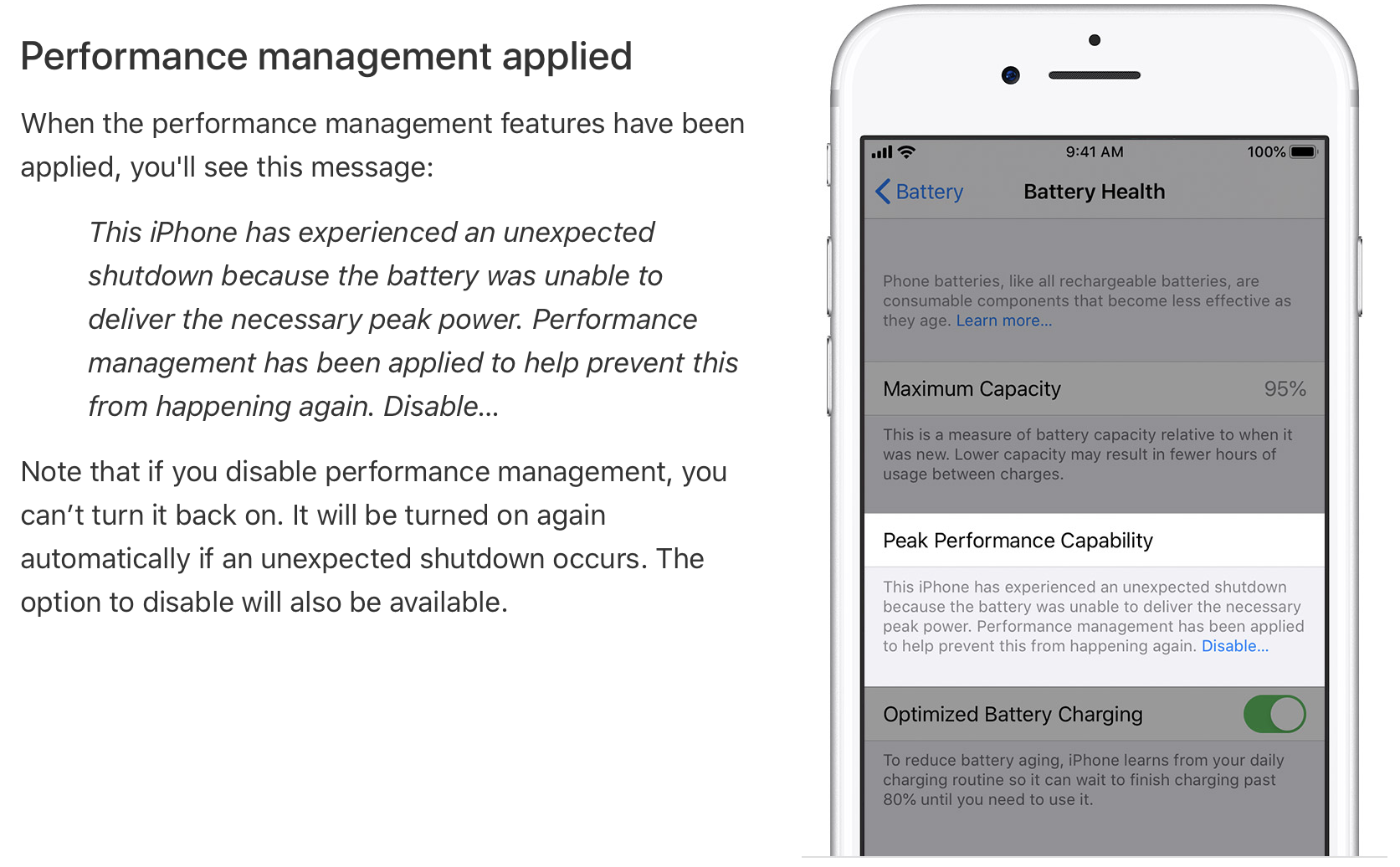 (Note: Devices updating from iOS 11.2.6 or earlier will initially have performance management disabled; it will be reenabled if the device subsequently experiences an unexpected shutdown.)