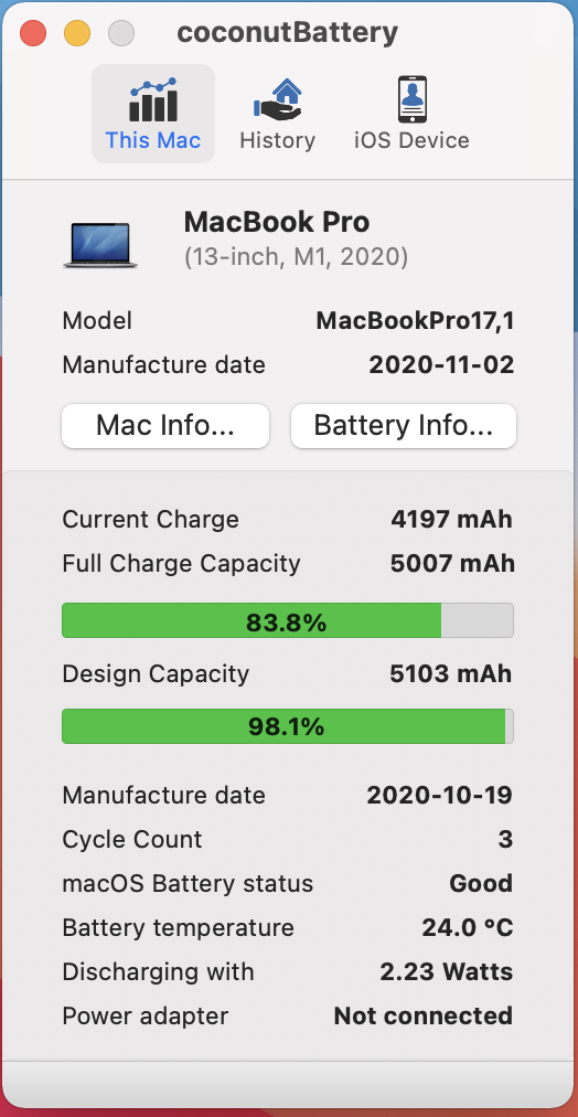 Also, there is quite a discrepancy from what the OS is telling me compared to Coconut but this is because MacOS uses a defensive calculation for the battery capacity value to define 100% (and the percentage calculation). coconutBattery reads out the raw battery data and can give you more precise information.