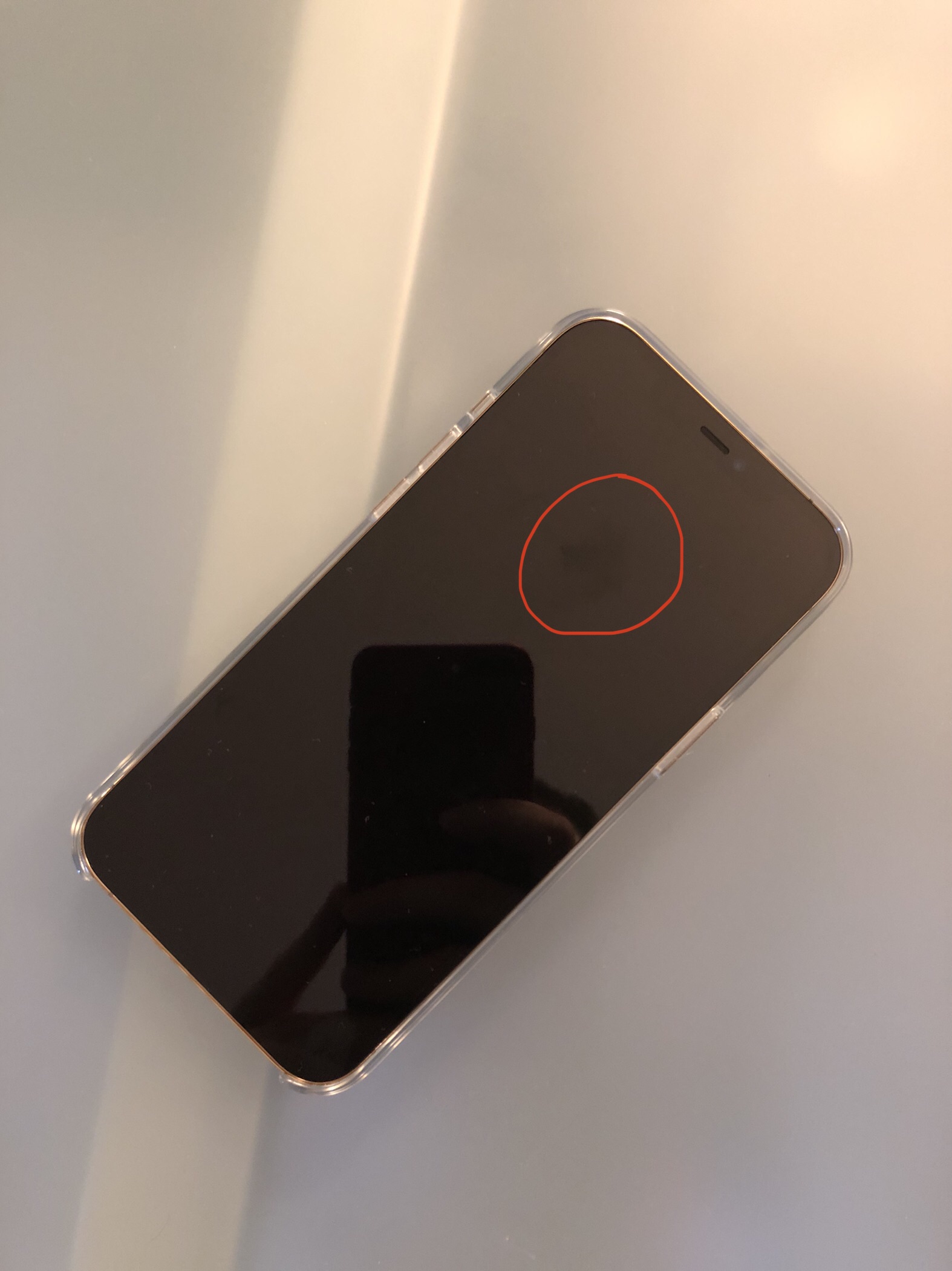 I bought an iPhone 12 Pro Max just few weeks ago and I always cleaned my iPhone as the Apple Support advices. Today I noticed a stain on the screen, I tried to clean it as always but nothing. Here is a pic (the stain is in the middle of the red circle)