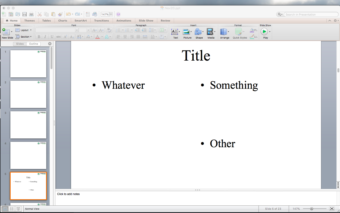 In the image below the Slide Show button on the bottom left has been clicked, the top menu bar has disappeared, but the presentation in clearly not in Slide Show mode. If I do Command-Tab to another app and then back to Powerpoint, when it comes back to power point it shows a black screen for about 1/2 a second as if it was switching to slide show mode but then it just displays the same screen as in the image below.
