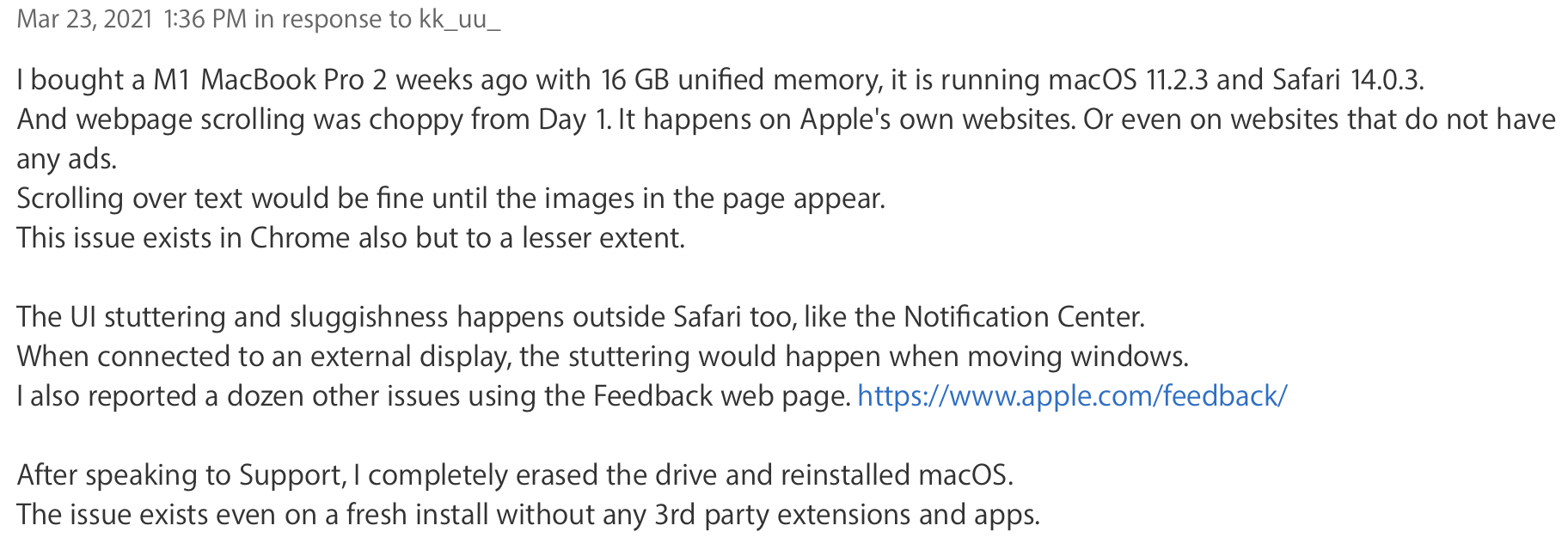 So i got this m1 mba 3 days ago.But i feel like its not that smooth while scrolling up and down on the pages. i mean at least not as smooth as my desktop pc.I feel like its a little bit laggy and choppy.Any ideas?