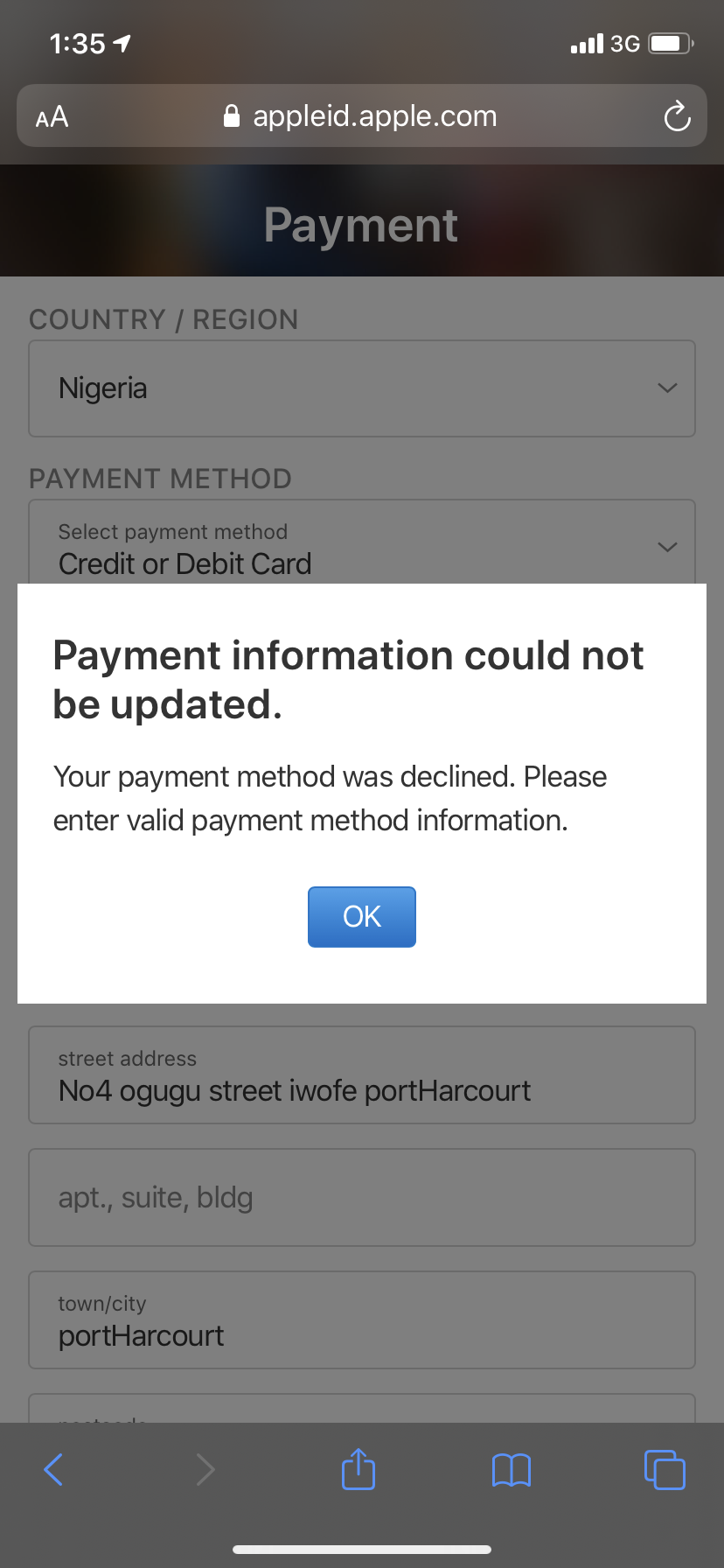 Try a different card (credit cards are more likely to work than debit cards ; not sure if this still applies in Nigeria : https://discussions.apple.com/thread/4098108?start=15&tstart=0)