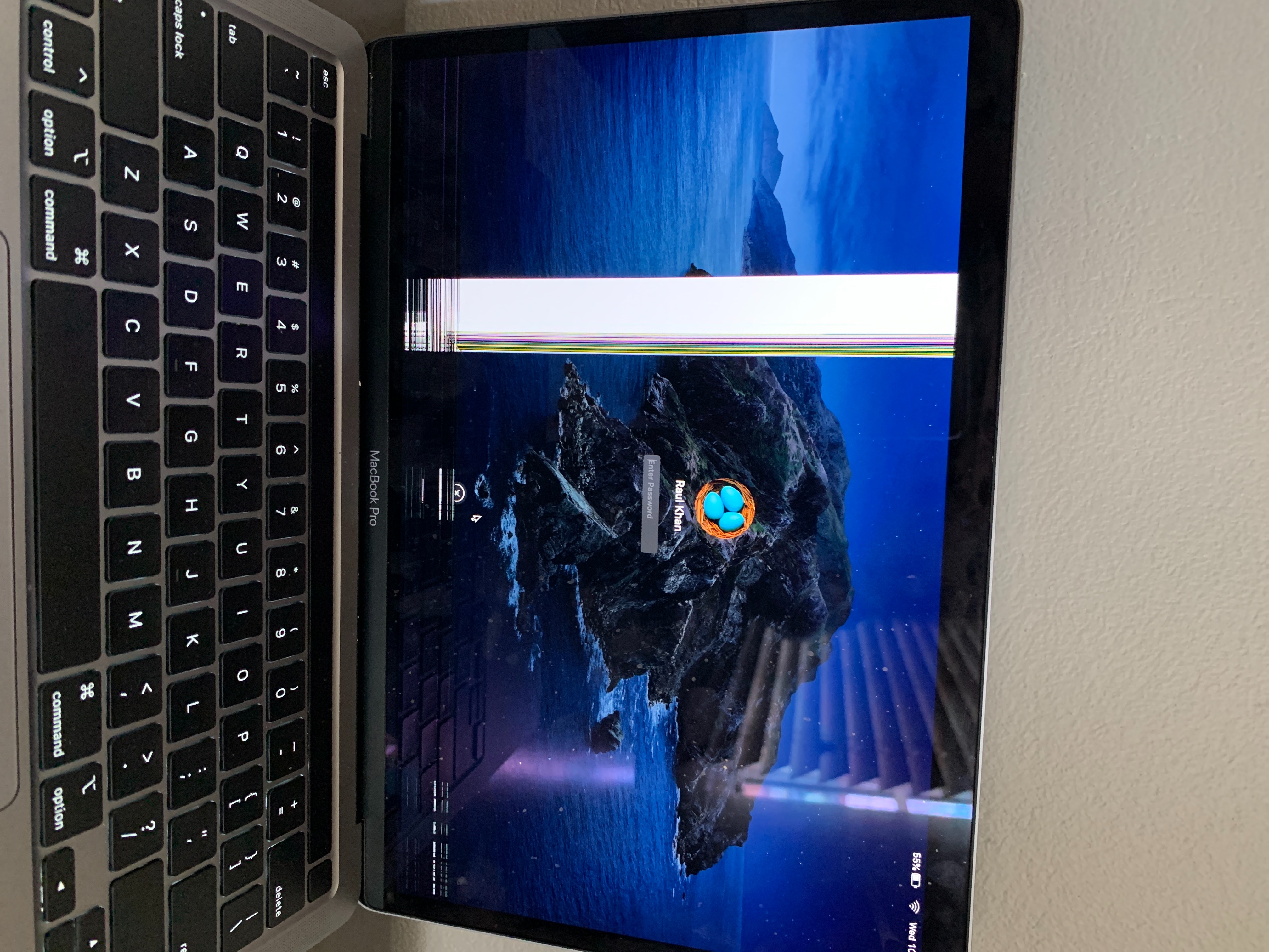 The MacBook Pro screen has colored lines when I open it and then the screen suddenly blanks off. Can you help? My son have school and all his school work is on the MacBook.