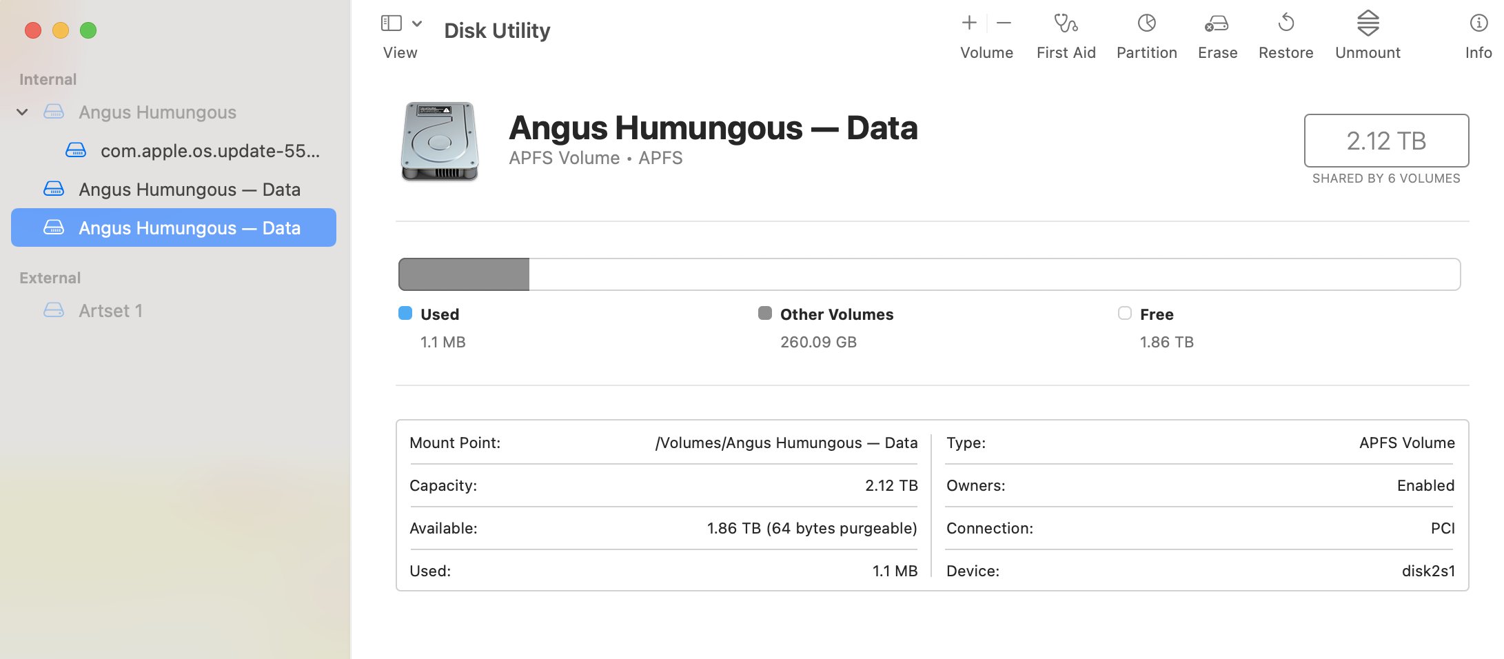/volumes/Angus Humongous – data/ This is the volume I want to remove/delete, providing it does not affect the other volume that has the system and all my data.