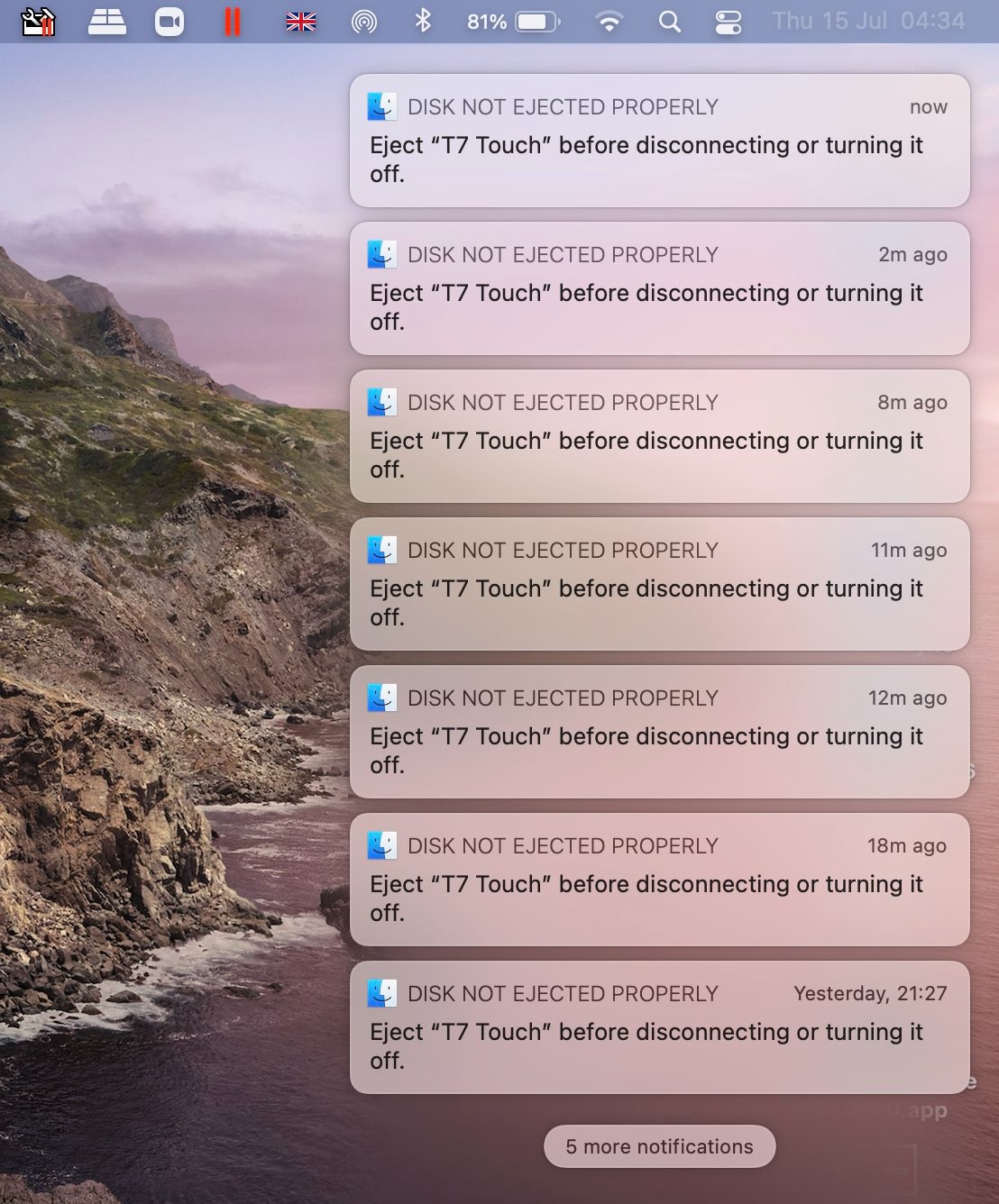 Upon boot one of my external SSD's gets hit with repeated disconnect notifications and I noticed that it's being 'synced' by Google Backup & Sync (as that's my destination for Google Drive). Once google drive is idle and done syncing, the notifications stop.
