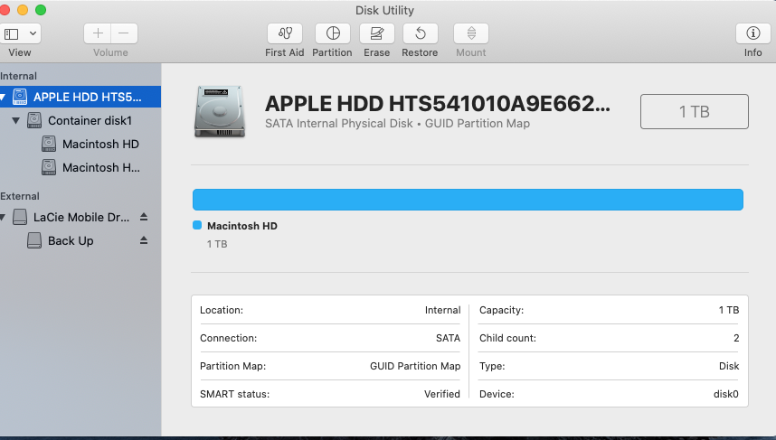 7. Select the main hard drive name, not your volumes. For example, select APPLE HDD, APPLE SSD, or Fusion Drive instead of “Macintosh HD.”