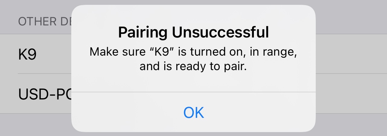 I have my iPhone X and my iPhone 12 Max Pro in front of me (both with iOS 14.3), along with a 3rd party Bluetooth 4.2+ device (K9). Both iPhones are on. I turn on the Bluetooth device (K9) and both iPhones see it available for pairing. When attempting to pair the iPhone 12 to the device it displays an error (see photo).