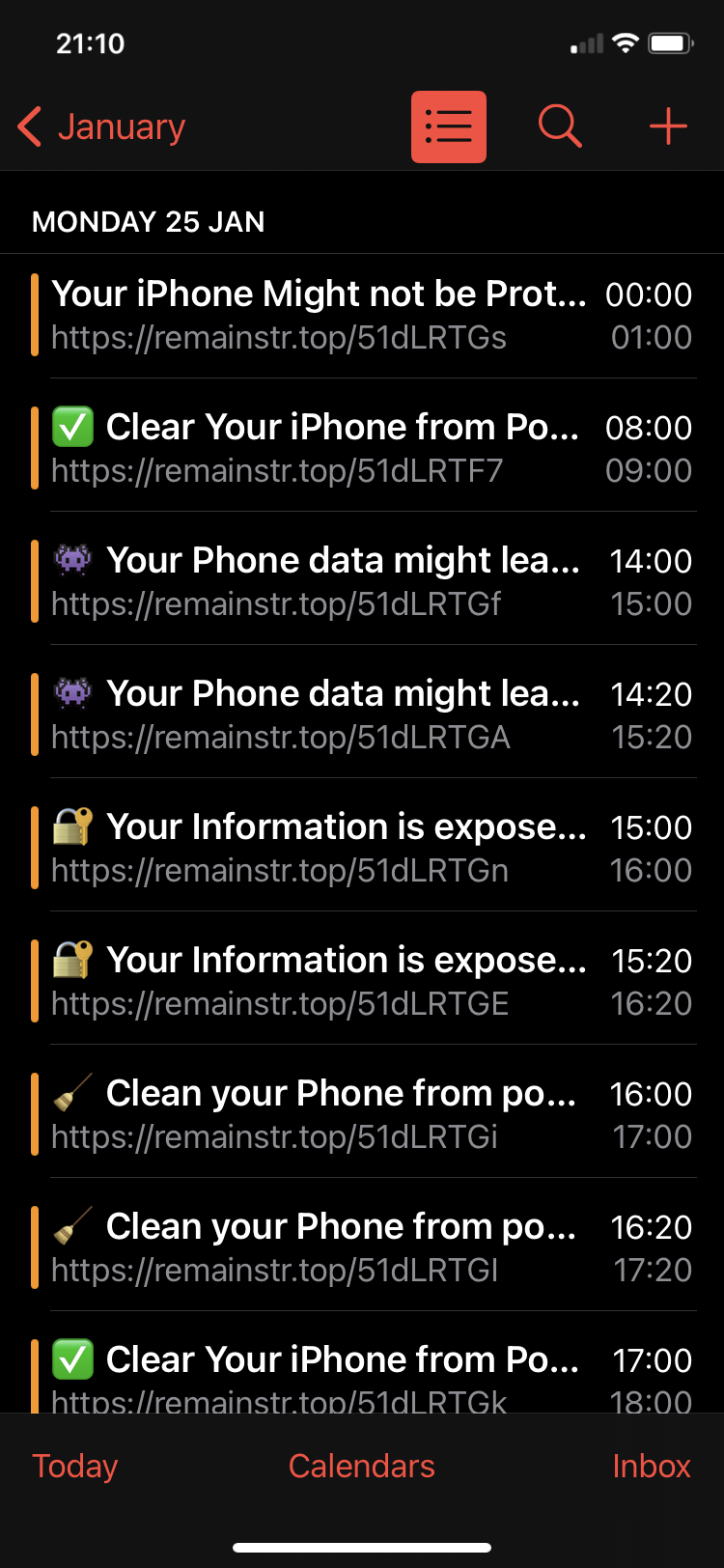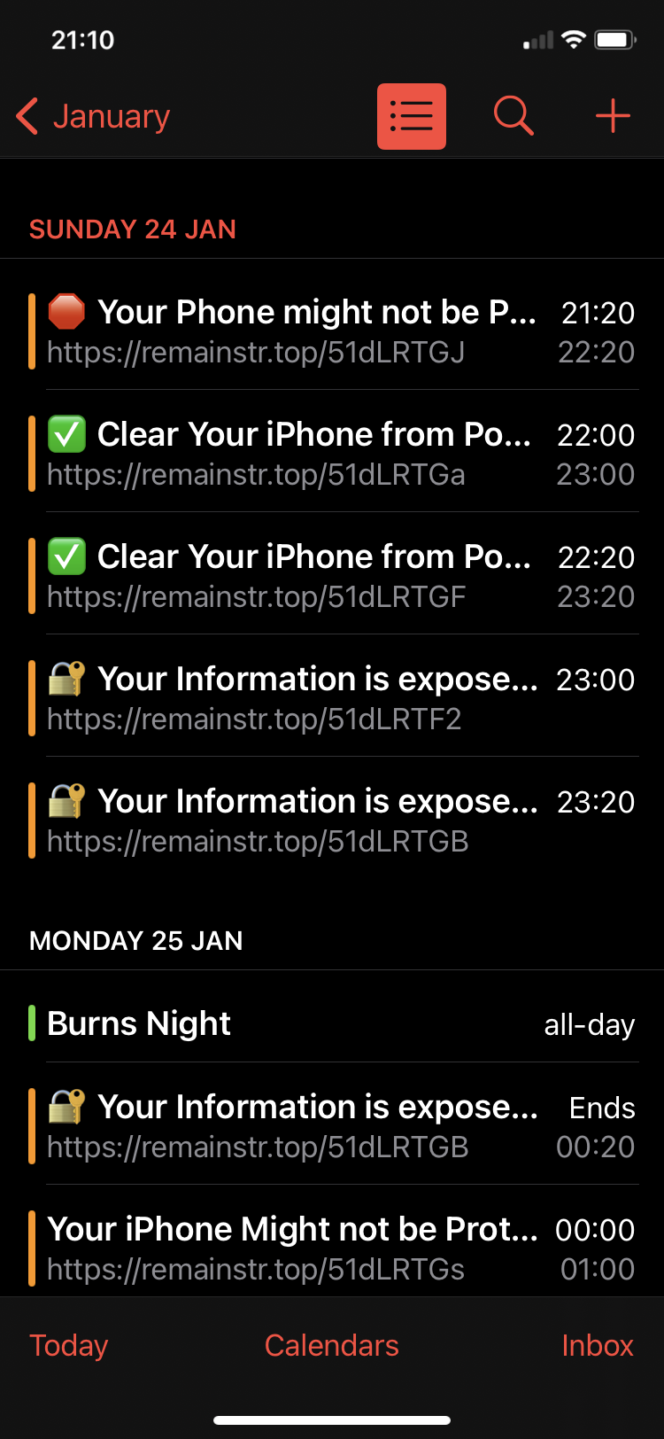 I have these warnings in my calendar that first started appearing when I visited a movie website and there is no options to delete or mute them, and more keep being made every few days. I don’t know what to do because I have tried following your previous advice about going to passwords and accounts and checking for unauthorised calendar accounts but I can’t find any and I don’t know where to go from here as they are still here and I’m getting worried. Help please.
