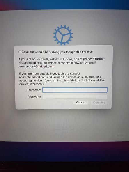 I recently upgraded to Catalina, but wanted to downgrade to Mojave again. I got a copy of Mojave (I believe from the App Store) and made a bootable USB from it. I booted from it, used disk utility to wipe my drive, and then proceeded to install the OS from the disk. Everything went normal and fine until rebooting and setting up the OS. After a couple of steps of setup it said that Indeed Inc was going to configure remote access of the the laptop. I clicked next was prompted for a Username and Password for Indeed. I was blocked from proceeding further without these credentials.