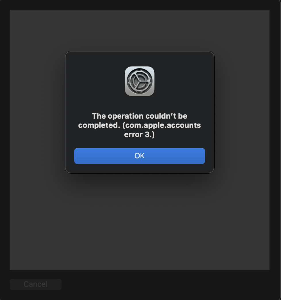 After I validate the 2FA request on my device, MacOS momentarily spins, as if successfully adding the account and then comes back with an error: "The operation couldn't be completed. (com.apple.accounts error 3.)