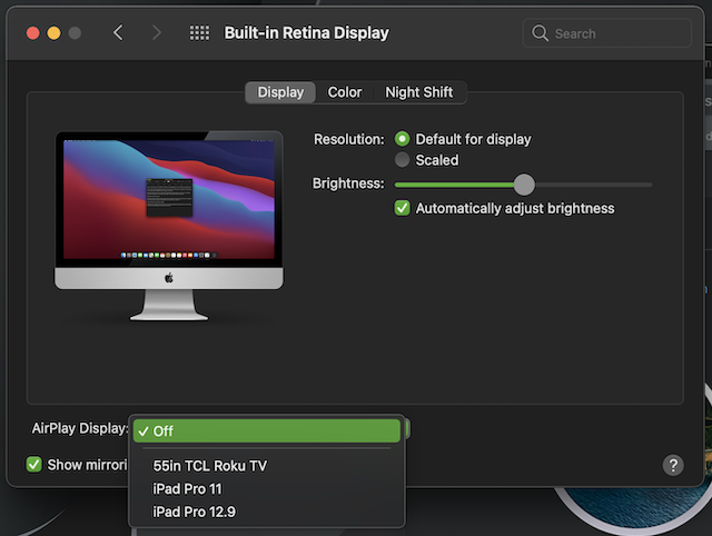 I'm using the latest macOS Big Sur on iMac (Late 2015), the AirPlay Display doesn't have any option except "Off" since Sierra or High Sierra. Do i need to buy TV to use the AirPlay Display on iMac? Since there's no option at all to change it.