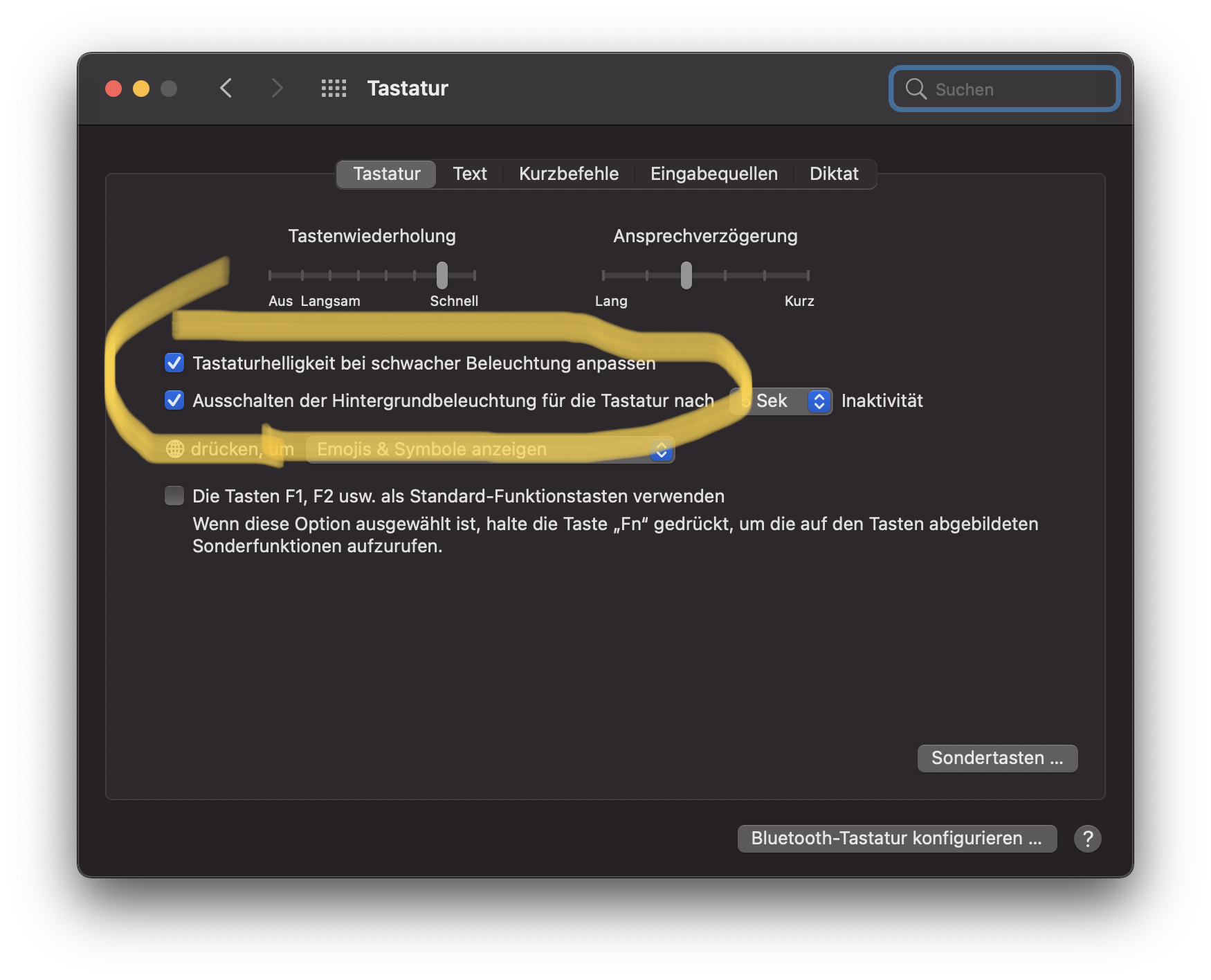 Sorry for German language. Even though the keyboard lighting is switched on in the settings the keys are not illuminated. Does anybody know what I am missing?