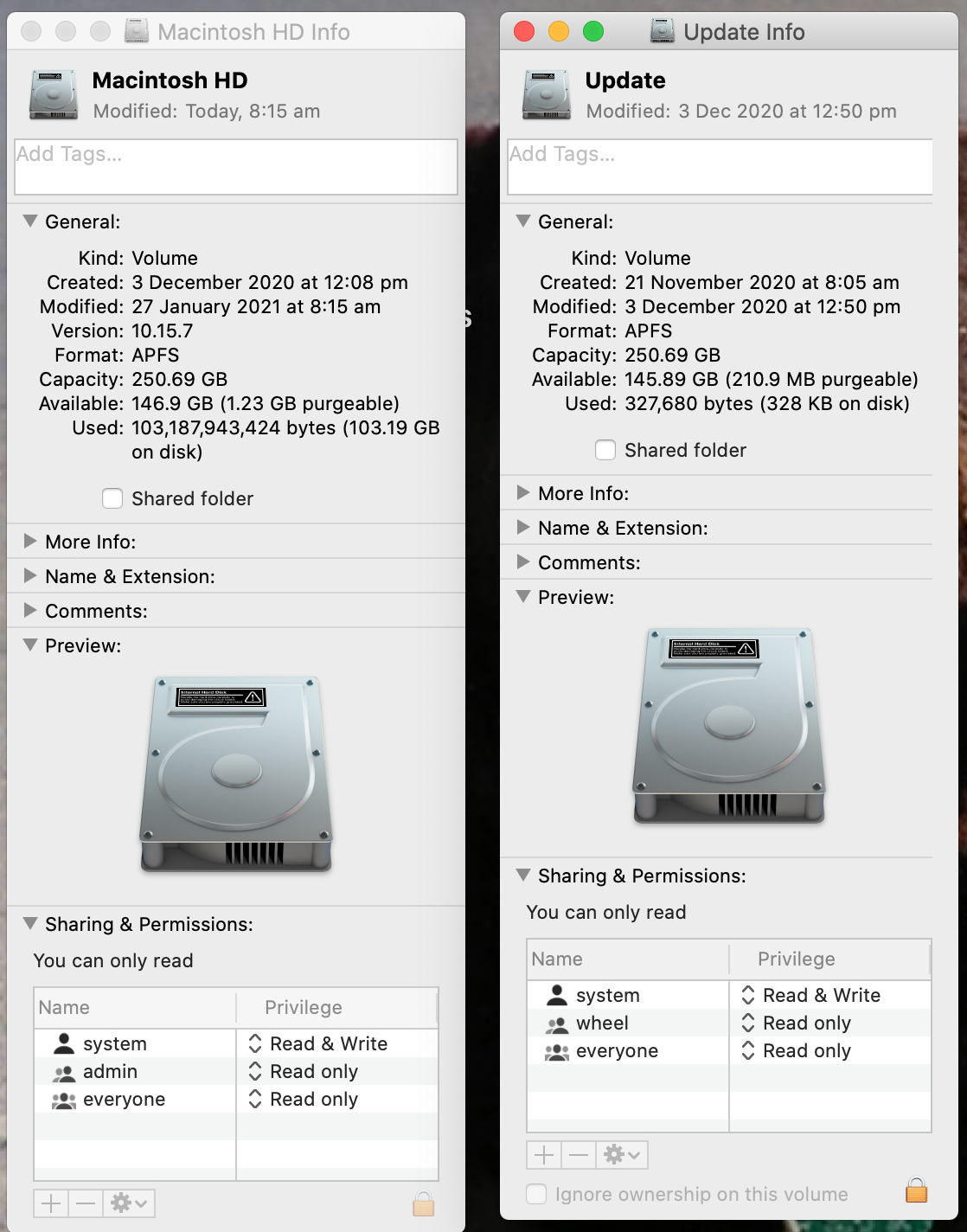 Then found a disc icon named "Update" on my desktop. Did a "Command I" to get info: provides my HD info, but nothing else.