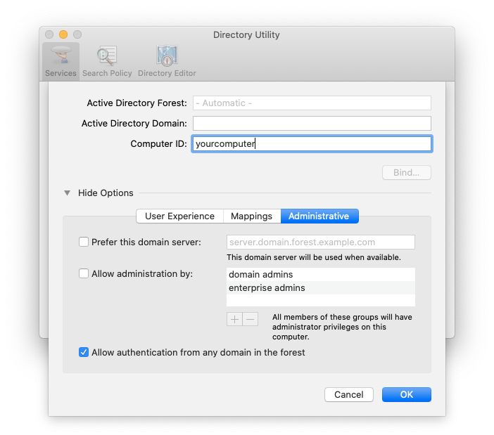Should do it? Obviously change the above to suit your domain. Using the GUI you'd drill down into Directory Utility's Advanced options: