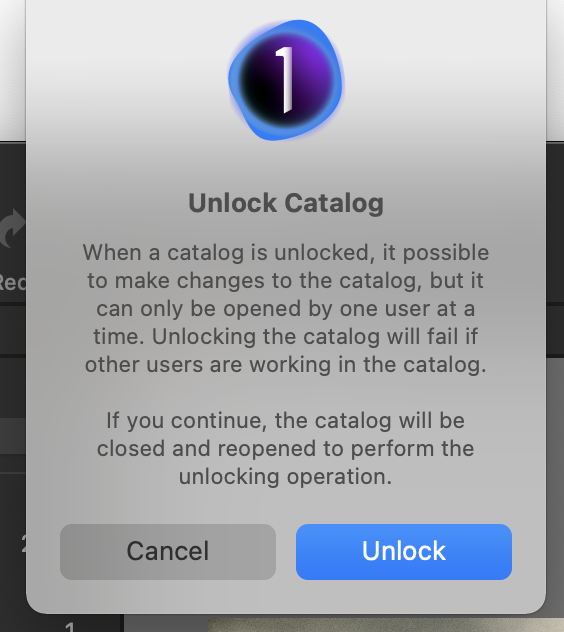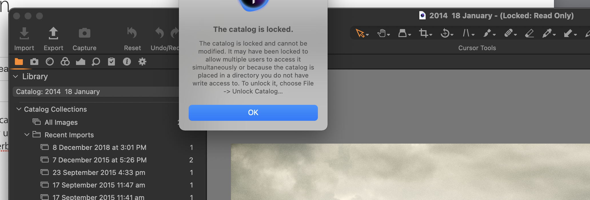 The File popdown has a listing to "Unlock" the catalog - I hit this button but it just reverts back to the "unlock" popdown. Capture One have been very helpful in trying to solve this issue but feel it may be an Apple issue? Not being too technical and getting on in years there is a high probability that I may be the issue! Being "read only" I cannot edit my catalogs in Capture One. However if I flip an image through to Photoshop I can work on it as per normal.