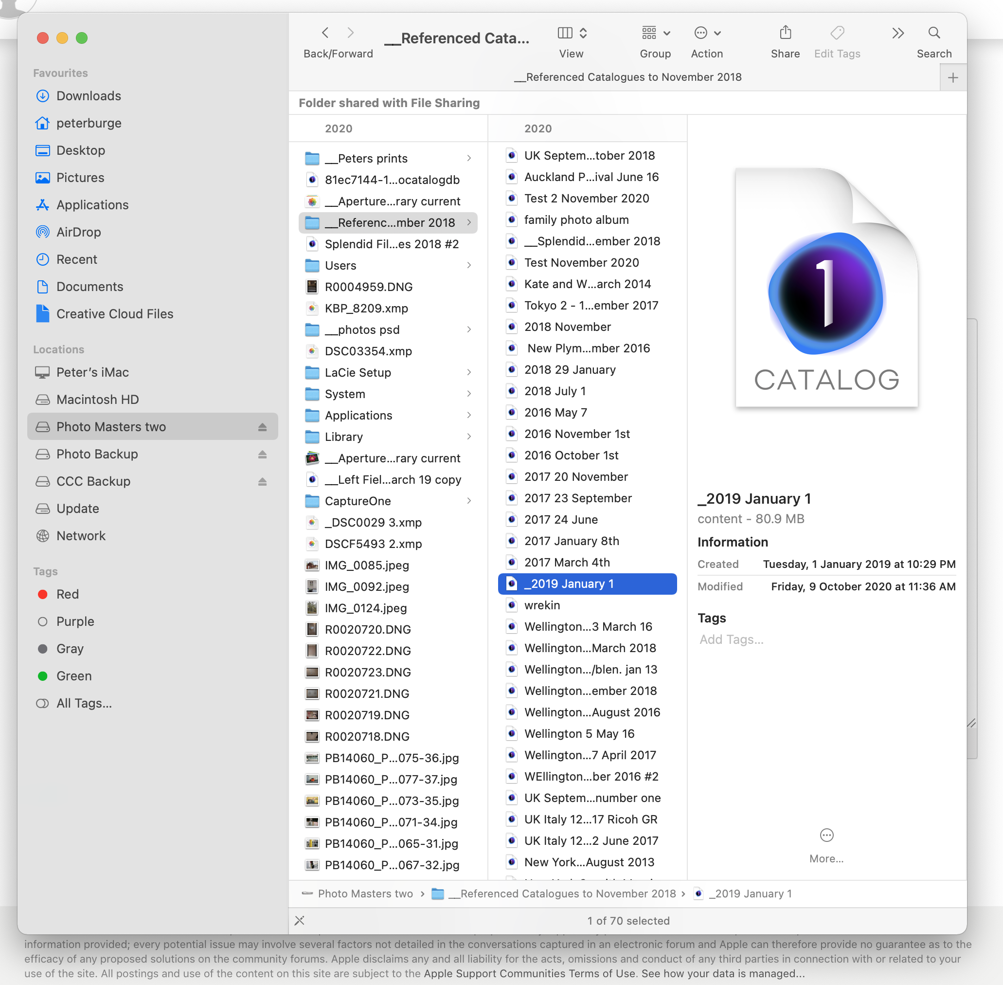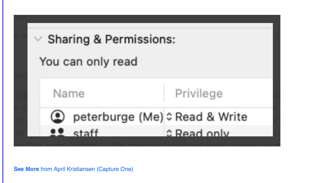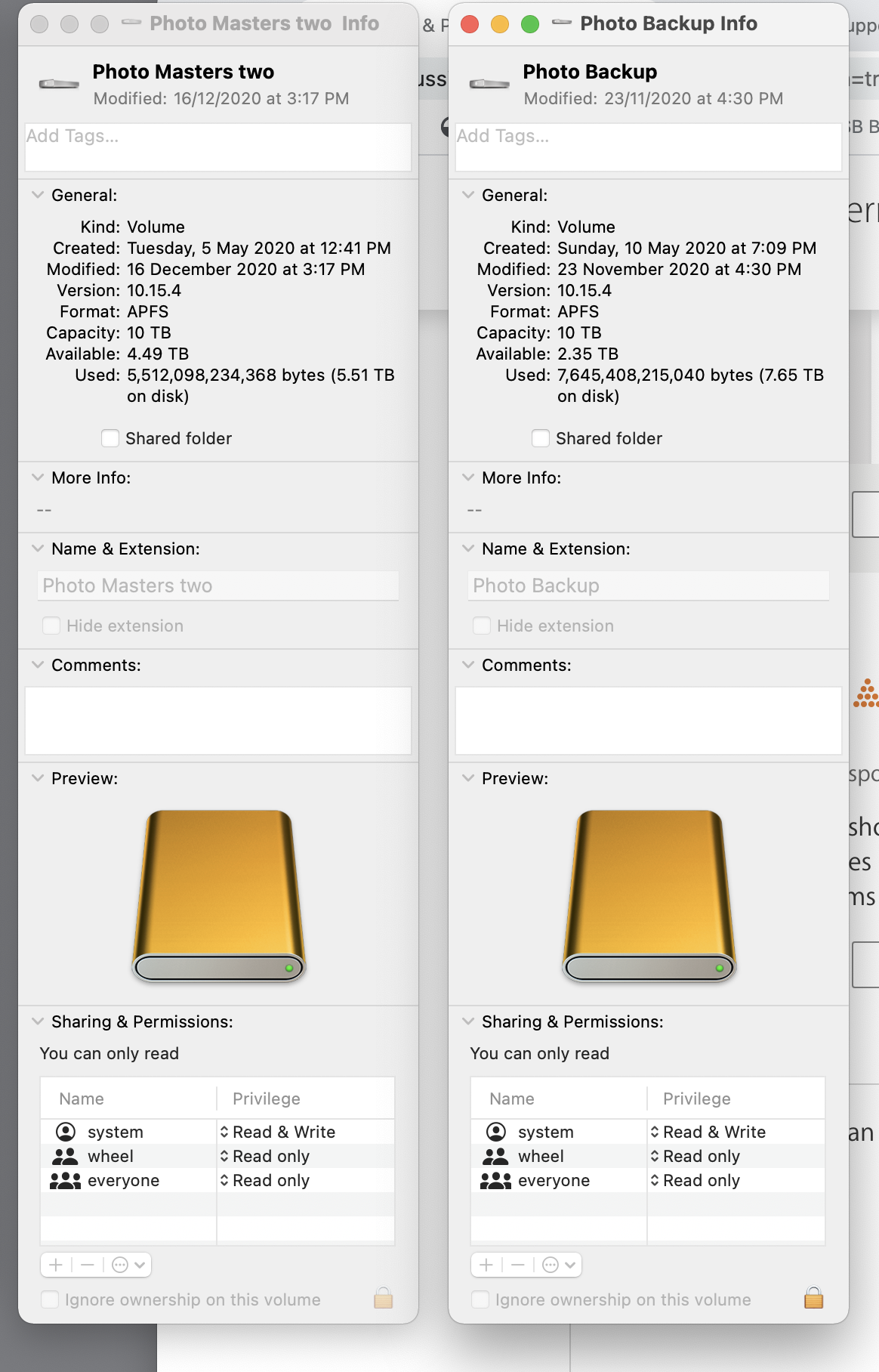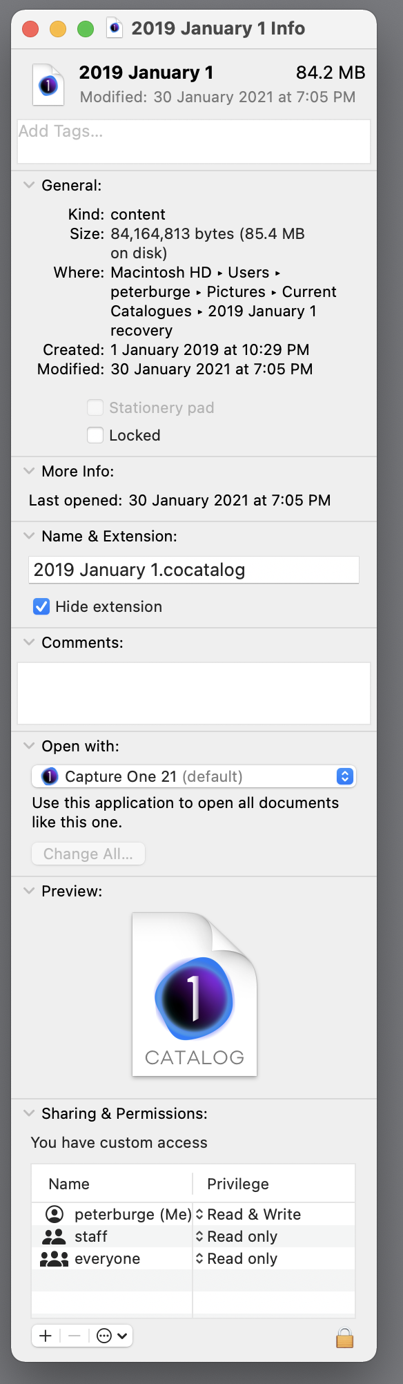 Most of my Capture One catalogs, stored on an external HD have become "read only." This may have been something to do with my upgrade to Big Sur but I'm not sure. The "Get Info" popup shows I have a "Read & Write Privilege" for peterburge (Me) but says beneath Sharing & Permissions: "You can only read."