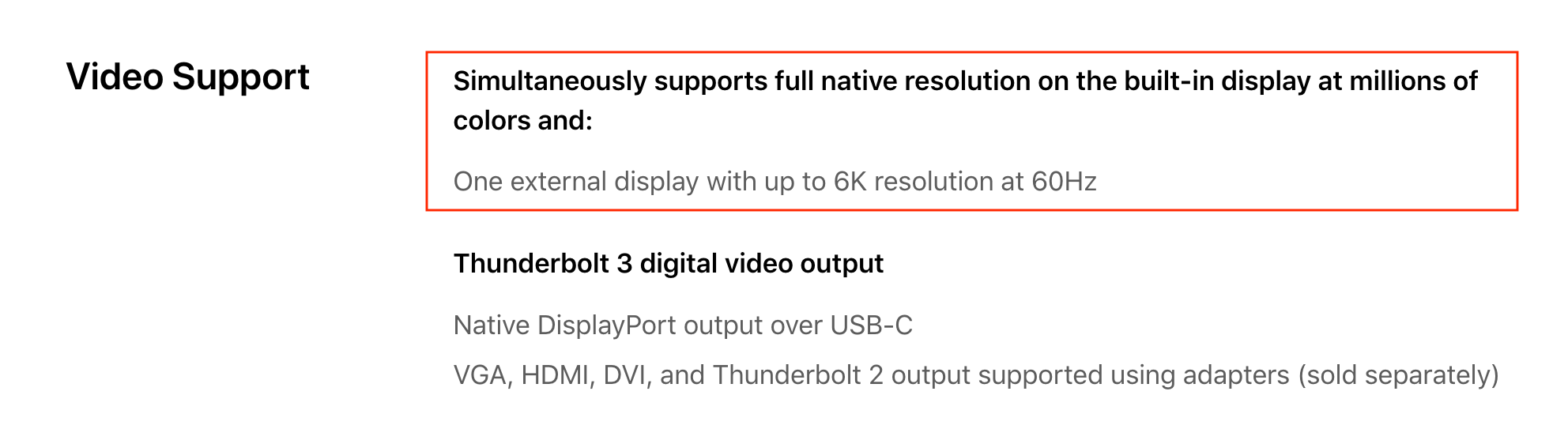 Machine specs for video Support says one external monitor is supported—M1 MacBookPro 13”