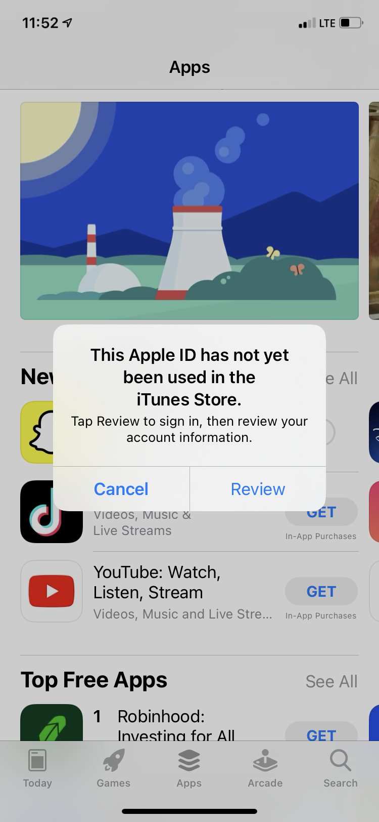 i’m trying to download apps on my new Apple ID, but it keeps telling me the Apple ID has never been used in the iTunes Store. It asks me to sign in to review but it keeps lagging. Ill insert a photo screenshot below. Please help me download apps on my new Apple ID on my iPhone 11.