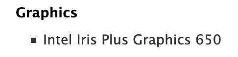 - Graphics: Intel Iris Plus Graphics 650 1536 MB