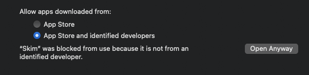 However, with some applications, this does not work and it will tell you it cannot open it. Don't cancel, but do visit System Preferences > Security & Privacy > General panel. You should see in the Allow apps downloaded from section, that Skim appears there, and you can click open anyway. Once you have done that, the application will work as expected, or should.