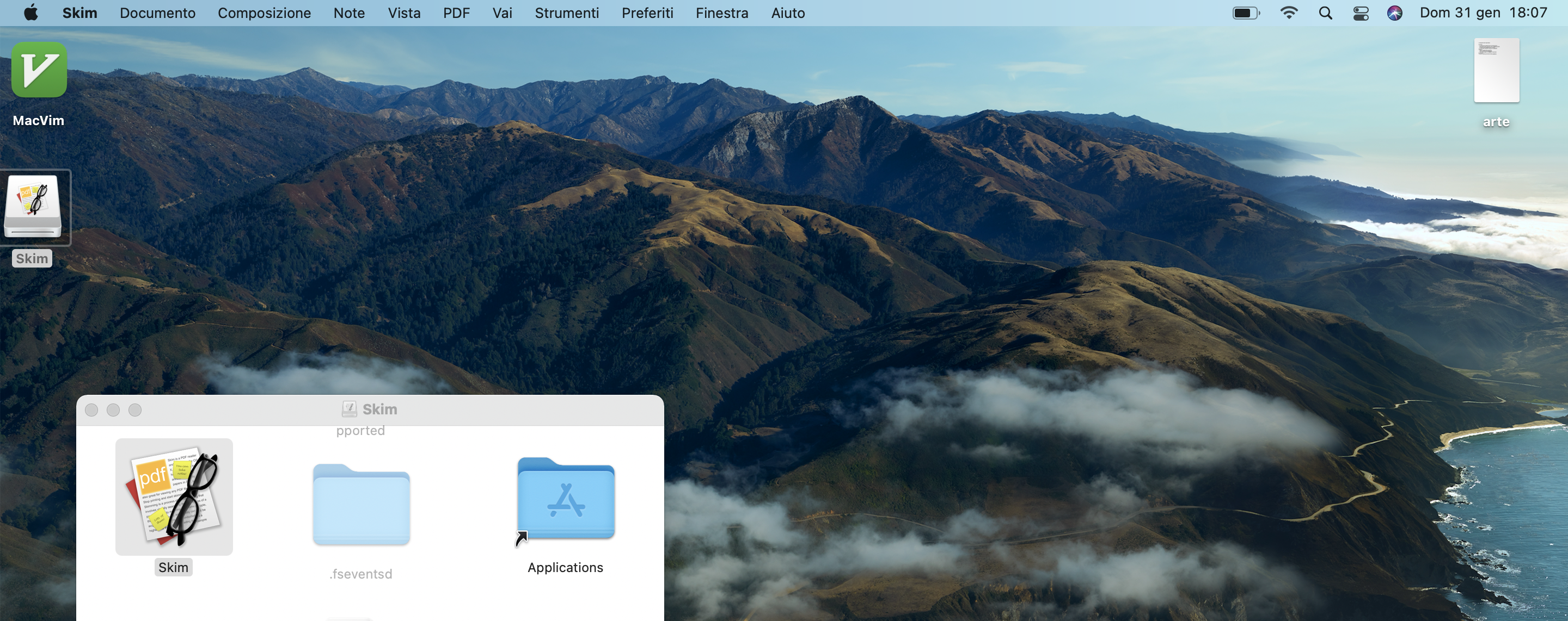 In the open Skim installer window, drag that Skim icon across and drop it on that Applications folder alias. That will install it. If you did this previously, the Finder will honk about replacing it. Do so.