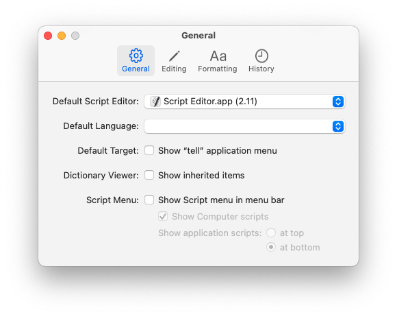For some reason, after the update to Big Sur 11.2, my Script Editor is no longer working. The app launches, but it refuses to open any Applescripts (no error message), and the 'Default Language' pop-up in the Preferences is blank (see screenshot).