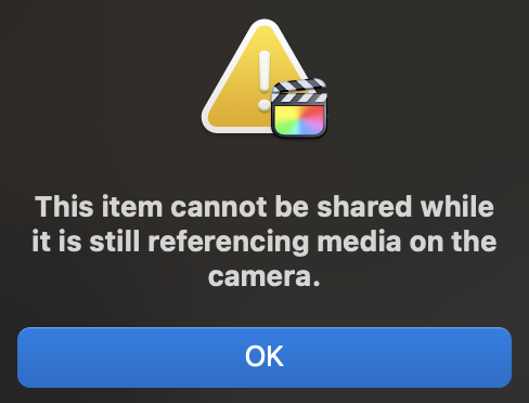 I was ready to export a video, and it says "This media cannot be shared while referencing media still on the camera"