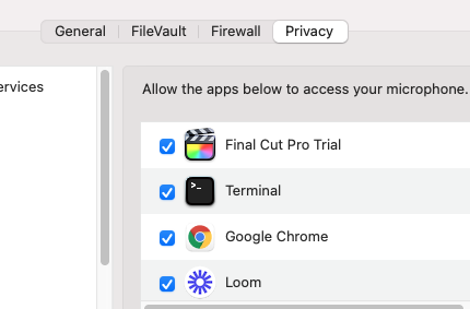 In the privacy preferences my mic is ticked to allow access to the app. I have also unchecked it multiple times and restarted my machine and the app to see if it would do anything.