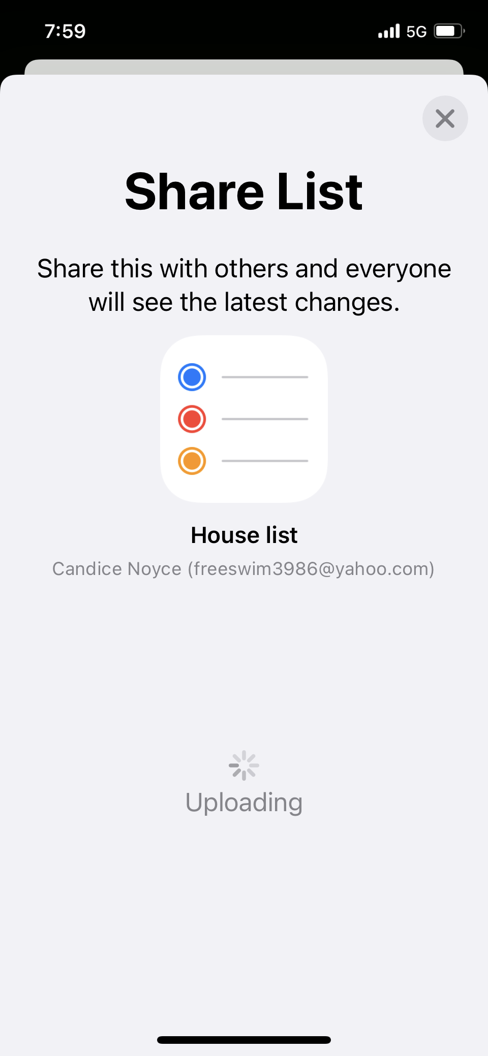 I try to share a reminder list with my husband, we both have iPhone 12 Pro, and my phone constantly says “uploading” no matter which way I choose to share. I’ve tried sharing via message, email and Facebook messenger. See screen shoot. Then the app freezes and I have to close the app.
