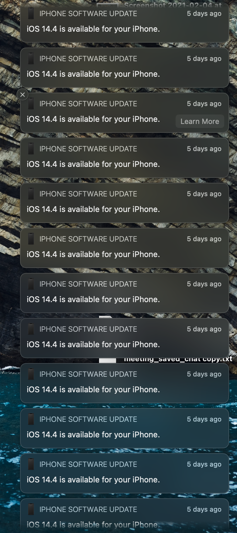 I recently plugged my iPhone into my MacBook Pro, for charging since I didn't have my charging brick available. Apparently there was an issue with the cable, which resulted in my computer registering it as my iPhone being connected to it easily over 250 times. No biggie thus far. But! There was an iOS update available, which shows as a notification. So now I have over 250 notifications in my Notification Center. The issue is that I can only remove each notification one by one, the option of "clear all" doesn't seem to be available to this type of notification. Any solutions? Not in the mood for +250 clicks.