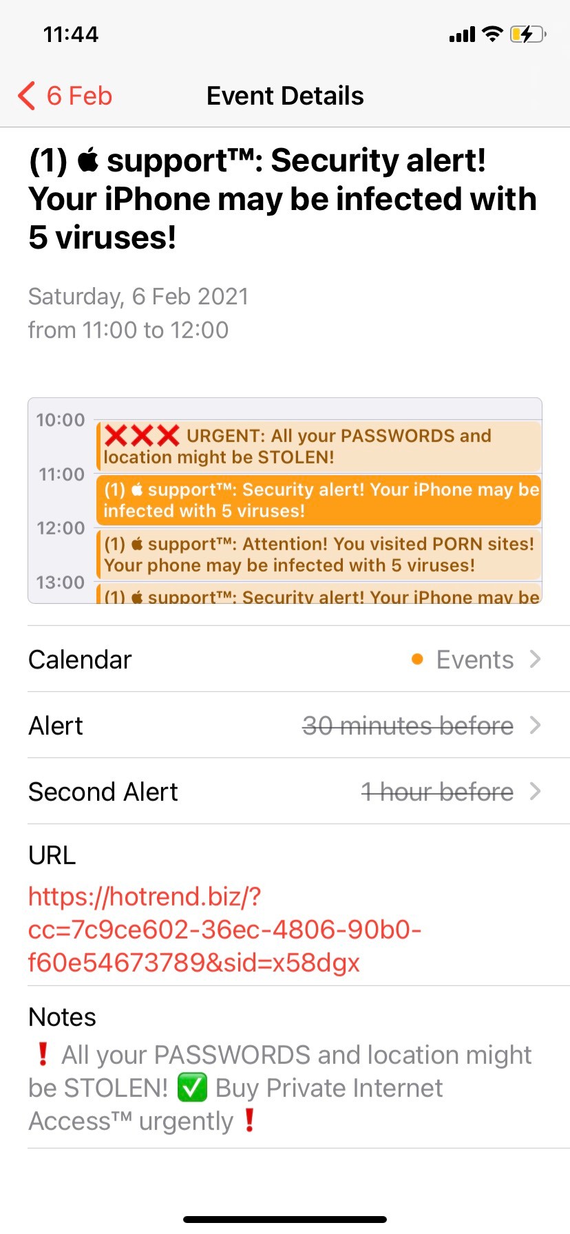 While browsing on my phone I accidentally clicked on a pop-up and have been getting event reminders about "virus on my phone" asking me to click on a suspicious link (hotrend.biz) - picture attached.