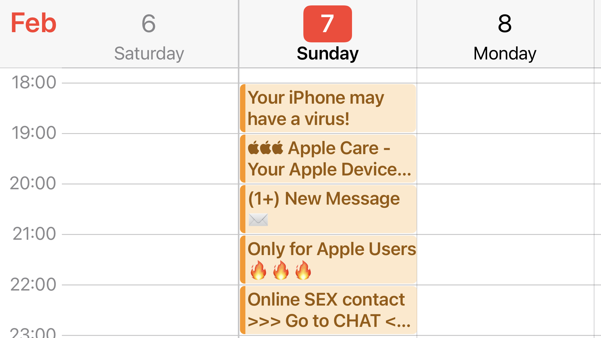 Good day, I was opening a website and a pop-up message came across that I allowed download something. After it my calender open and I see this events have been added and I can't delete it. I tried the suggestion posted here last year, ( go to Settings -> Passwords -> Calender -> check if another calender was there) but it doesn't work. I don't have any other calender. Please assist me with this matter. 🙏🏻