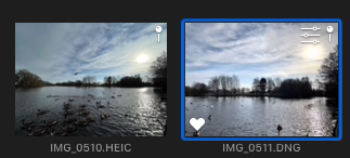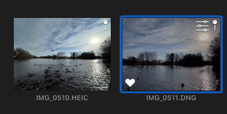 I can edit them on the phone, and they still transfer fine as DNG, with the edited preview, and edits intact (I can successfully export the original DNG, and a correctly edited jpg. Just by way of example, here is that same pair of thumbnails, but with the exposure of the DNG corrected on my phone. As you can see by comparing with the screenshot above, this exposure correction has been correctly transferred to my Mac.