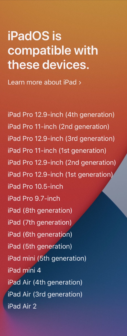 Newer models, not appearing in this list, are all able to be updated to the current version, iPadOS 14.4.