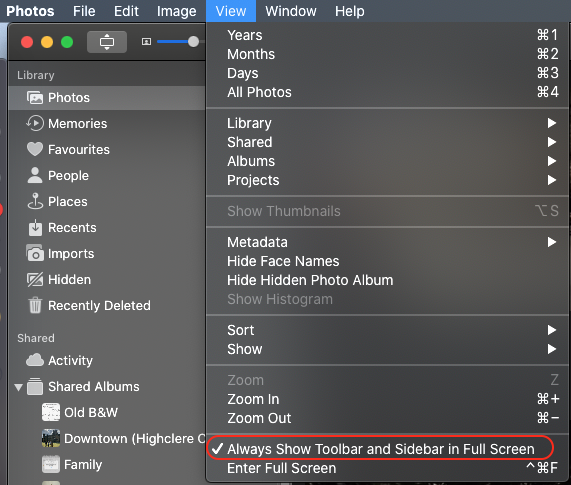 how do I get the old sidebar back in Photos? I can't see projects, albums, places, etc (OS 11.2 iMac 2019)