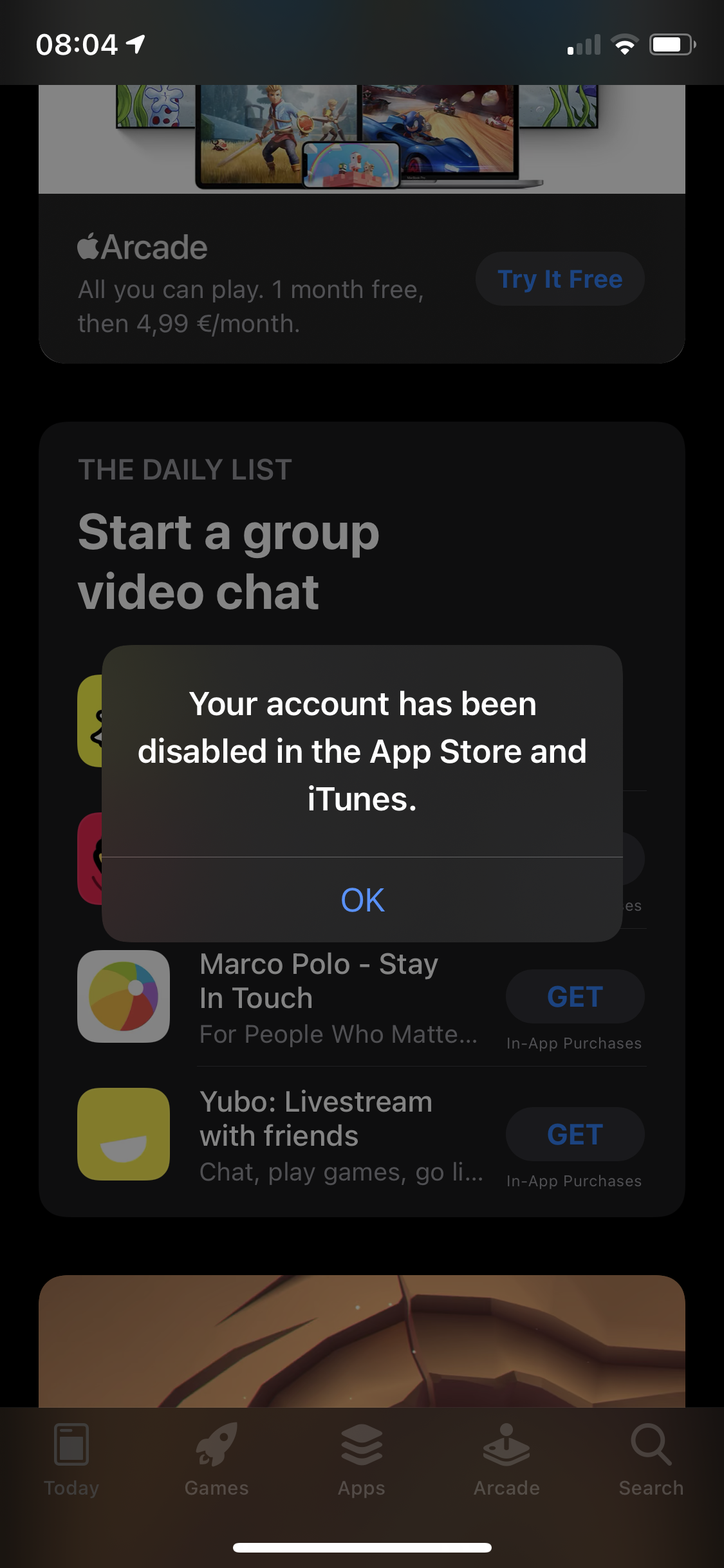 when i want to get a new app or update it it shows “your account has been disabled in the App Store and iTunes “