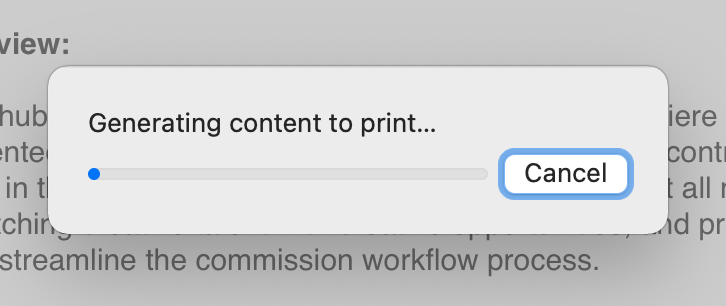 Usually it generates a "generating content to print..." message, which can take up o 60 seconds before I actual get a print screen. (Screen shot attached.)