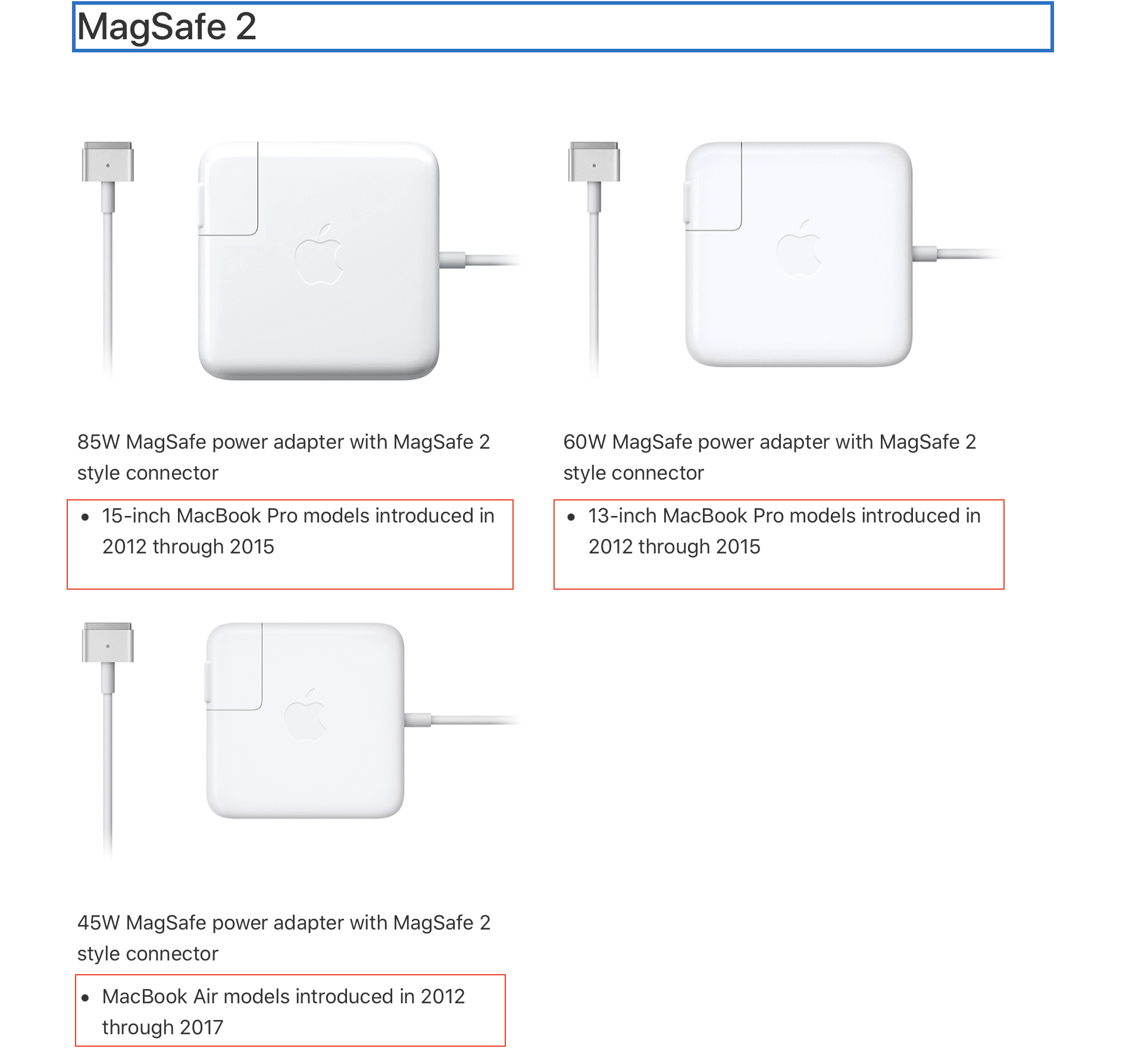 Will it work yes. The only difference is watts, they are interchangeable, yes. Your Mac will never overcharge. The consequence of a lower wattage charger on a machine that specs for a higher wattage is it will charge slower—is it harmful no. Using a higher wattage charger on a mac that specs out for a lower wattage charge—no downside, that Mac regulates the input— so no harm. The less the wattage charger the less they cost—this is a difference. To your question about your magsafe2 connector—there is NO difference. None. Exactly the same. If you are still in doubt revisit the graphics presented above.