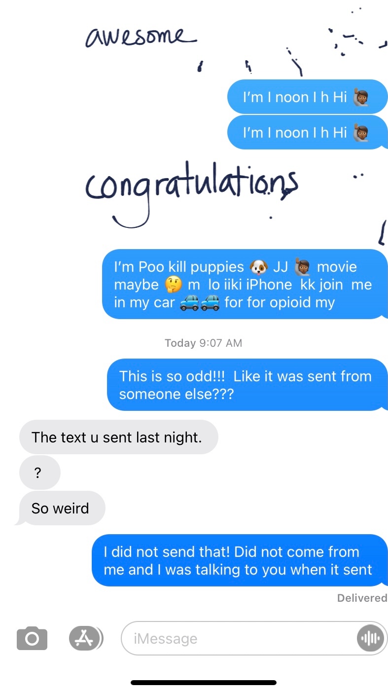 My phone sent a very odd message to a friend while I was talking to her. It was a mix of emojis and written text that made no sense a and I did not write. Should I be concerned I have been hacked? Definitely seems dangerous that someone could send a message from my phone I didn’t send. Please advise