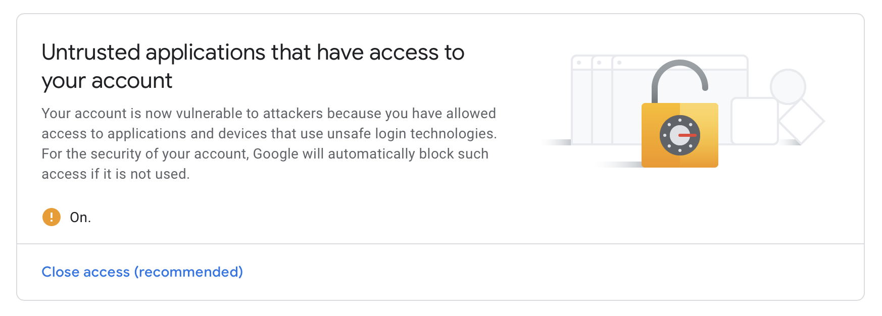 Same time when I log in with this account to google in browser, I see in this google account access for 3rd party untrusted applications is enabled: