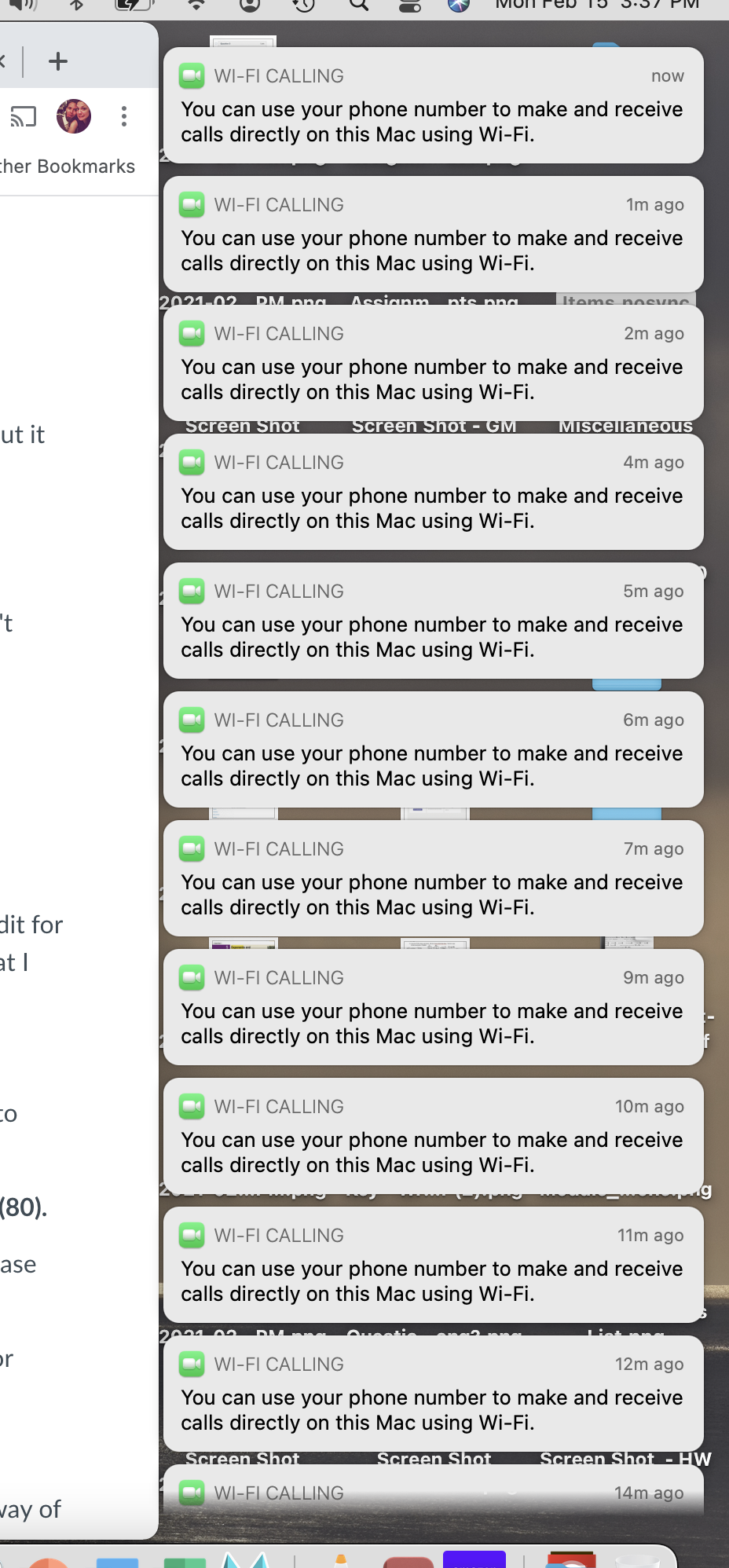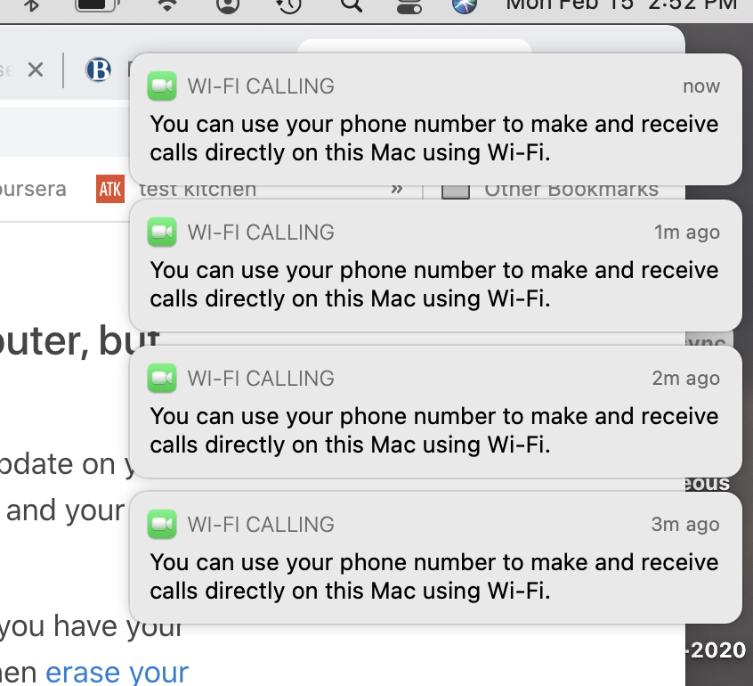 I just bought an iPhone 12 Pro, and since activating it, my MacBook Pro now displays a "Wi-Fi Calling" notification EVERY MINUTE (see attached screenshot). I have tried using the only two settings options it populates, which are "turn on" and "not now". Neither stops the notification from continuing.