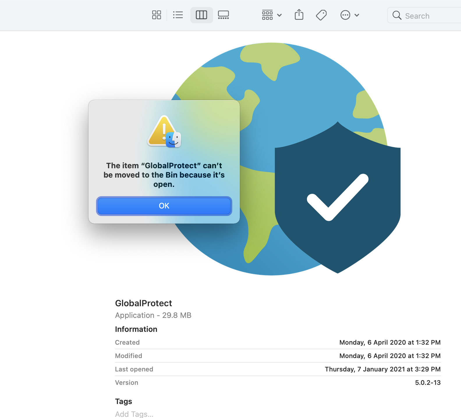 I am going to applications and trying to delete GlobalProtect. It says it is in use.