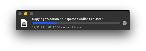 Progress is about 40GByte/Hr. Not fast as this is double copying through the computer from network source to network target.