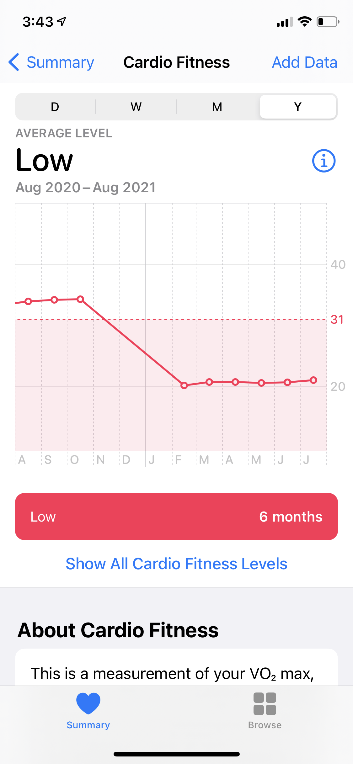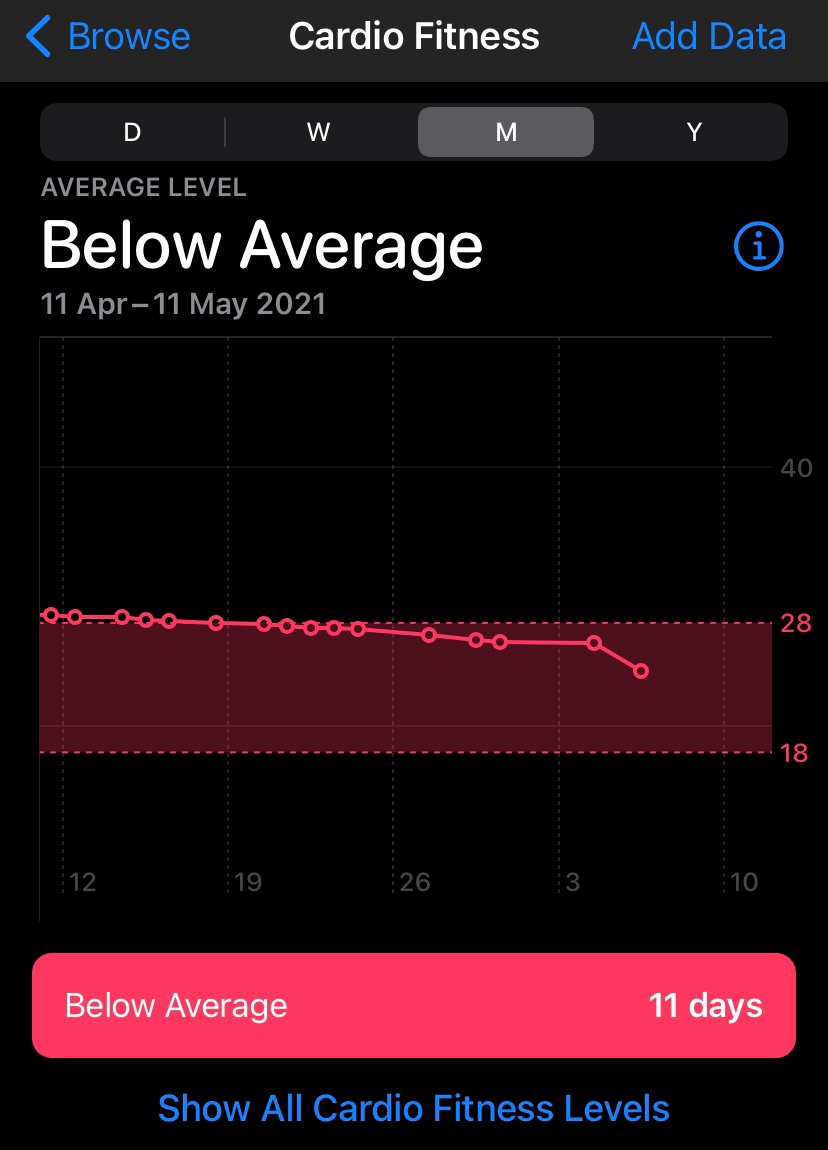 I have experienced this issue since Dec 2020/Jan 2021. I have a Series 3 watch , owned since July 2019, and the new iPhone SE which I’ve had since September 2020. I’m a 21 yr old female who walks at least 3 miles everyday and does at least an hour of HIIT/cardio/etc as well as a uni student. In Dec 2020 I recorded an average of 38.8 VO2. Suddenly in Jan 2021 it dropped to 35.4. Didn’t think much of it as I had changed my routine slightly to cope with uni work. It then dropped again and now sits at around 30.1 VO2 despite an increase in walking distance, occasional run and my routine picking up again. This is very disappointing to someone like me who has struggled a lot with their view toward their body image and workout routine, often having to reminded not to overtrain and such.